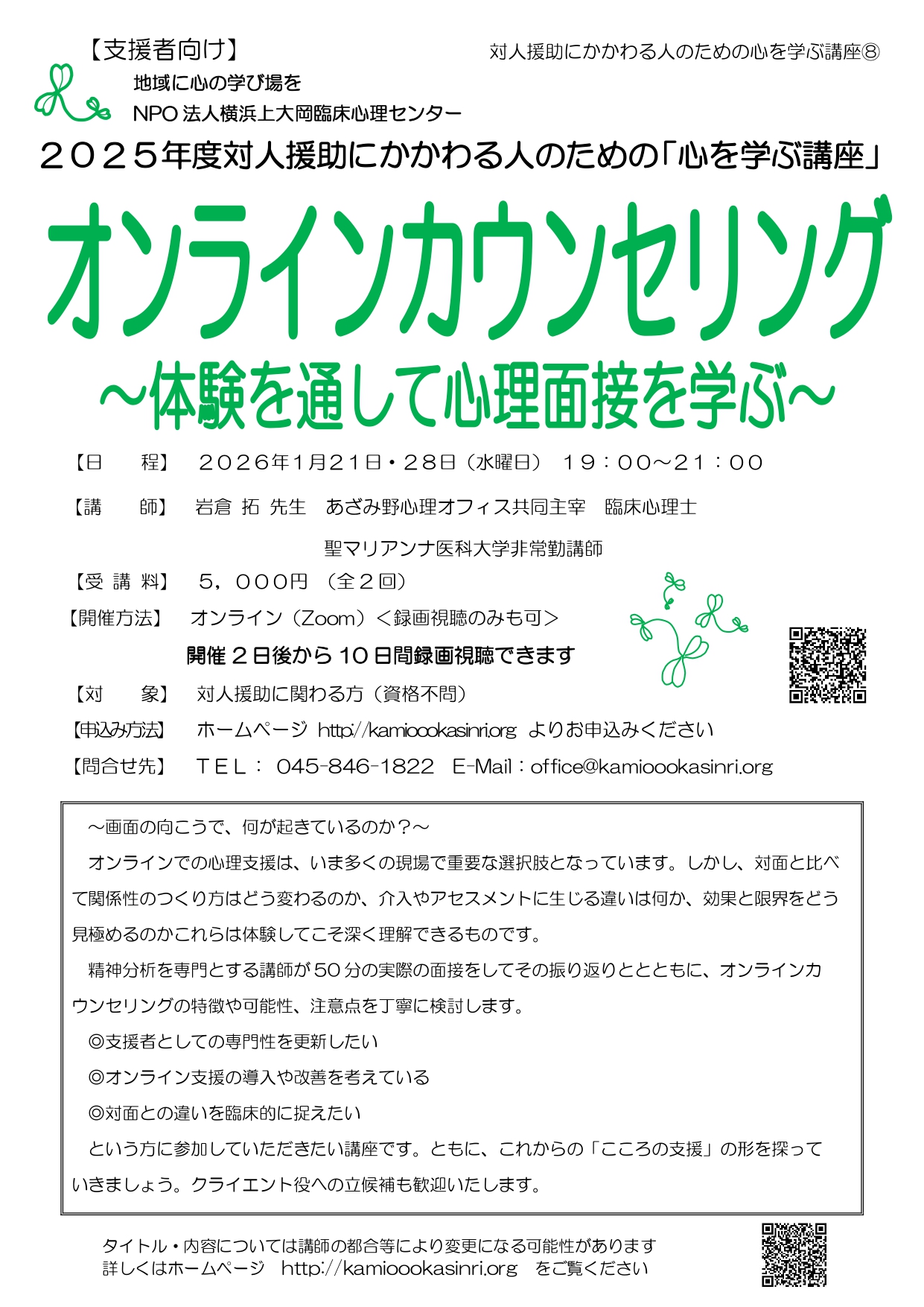 - 学会・研修会に横浜上大岡臨床心理センター「オンラインカウンセリング〜体験を通して心理面接を学ぶ〜」のご案内を掲載しました。